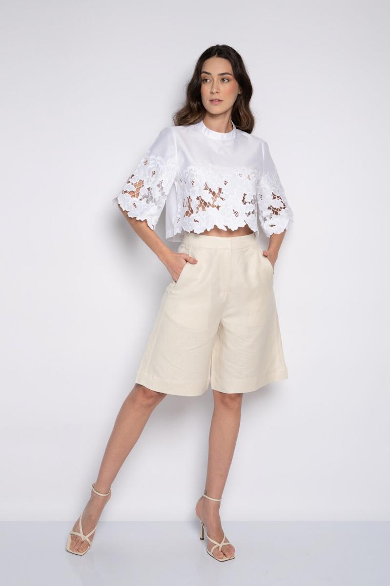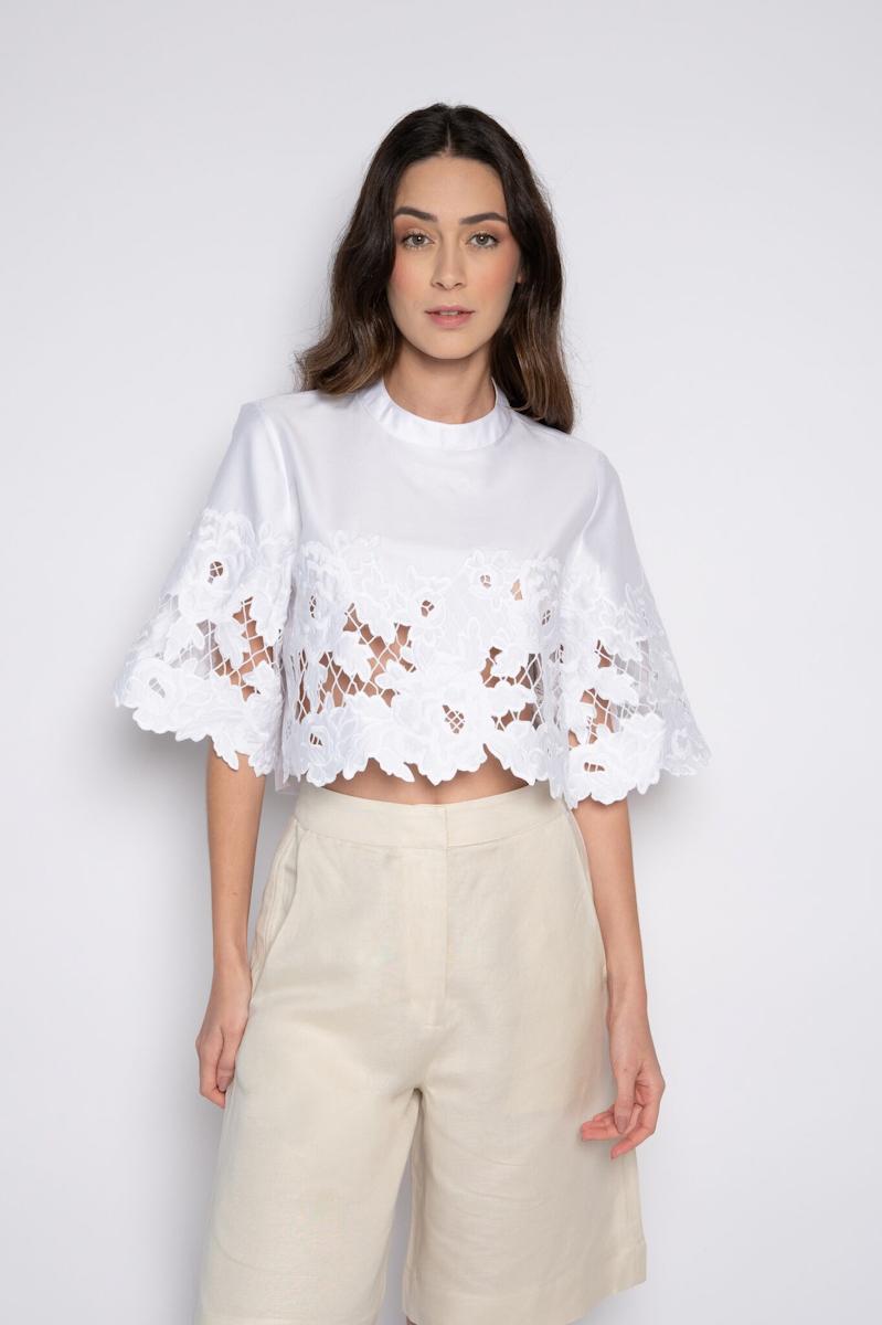 A blusa bordada, tecido 100% algodão proporciona toque macio e respirabilidade. Por isso, o uso prolongado torna-se mais agradável em diferentes temperaturas. Mangas curtas e ampla. Fechamento nas costas com botão coberto.