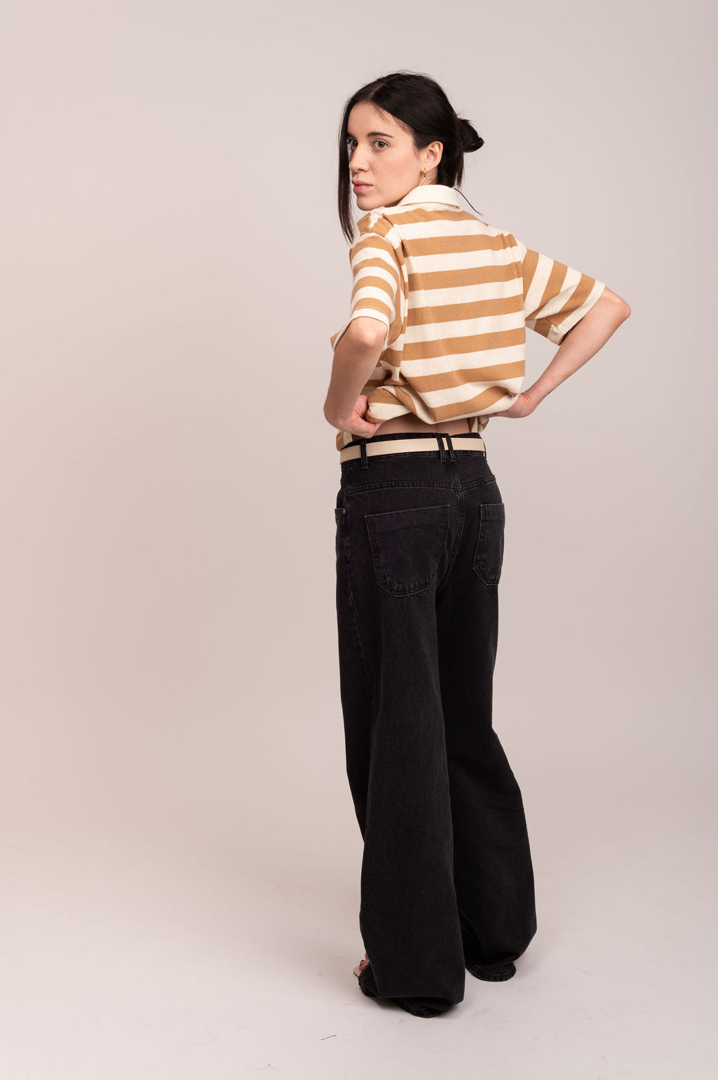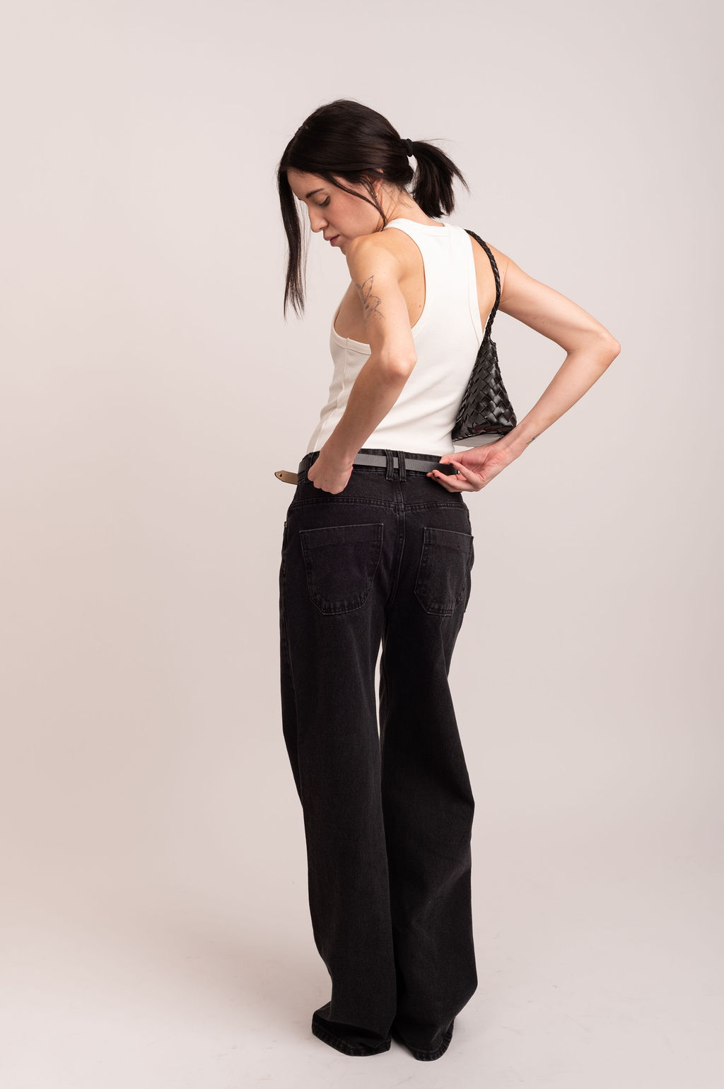 Com modelagem reta e jeans de lavagem mais escura, ela é perfeita para diversas ocasiões. Destaque-se com o rebite personalizado e o cós largo, que garantem sofisticação. Os bolsos laterais e traseiros, além do passante duplo, oferecem praticidade. O fechamento por zíper e botão personalizado finaliza com requinte.