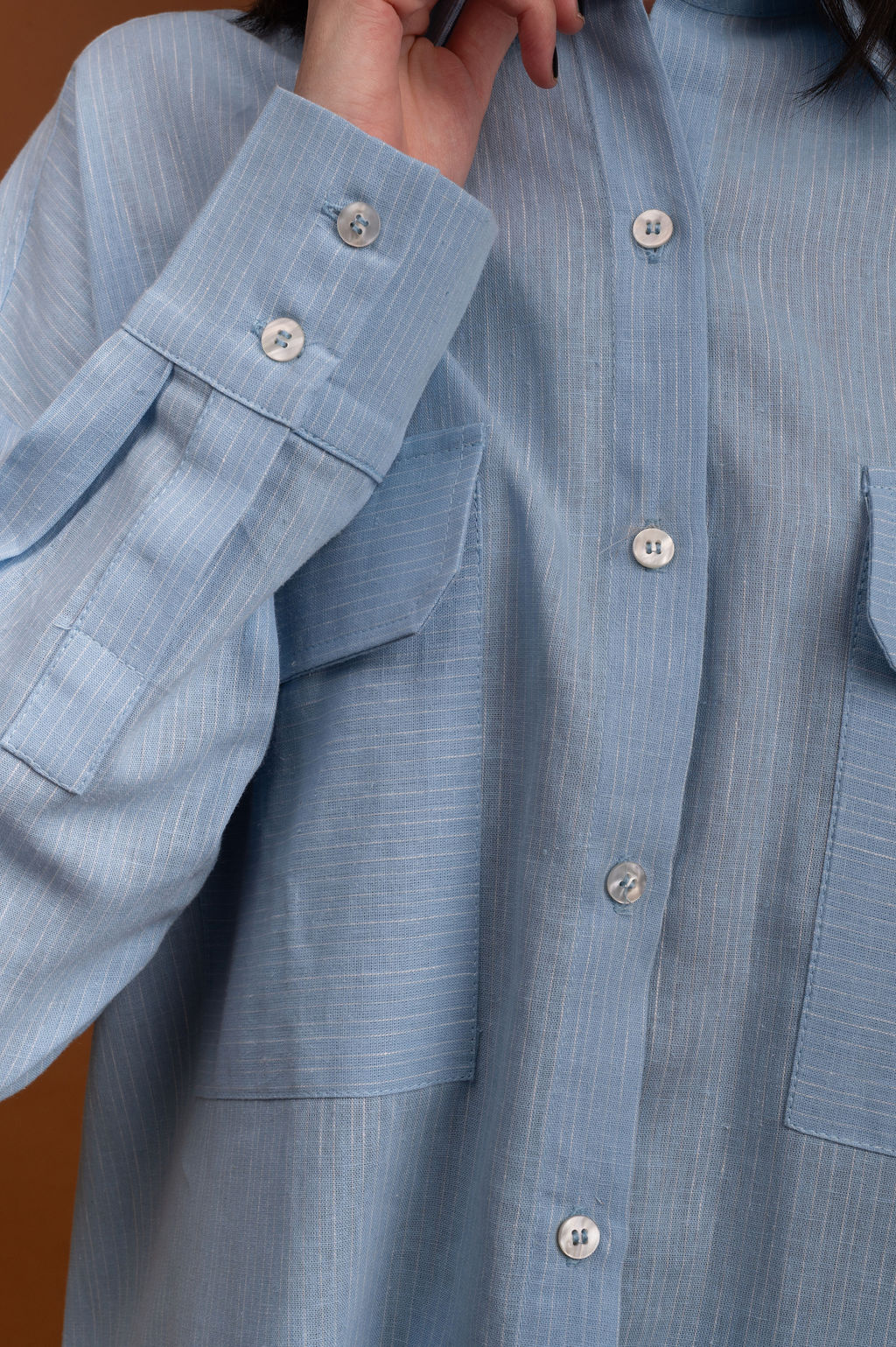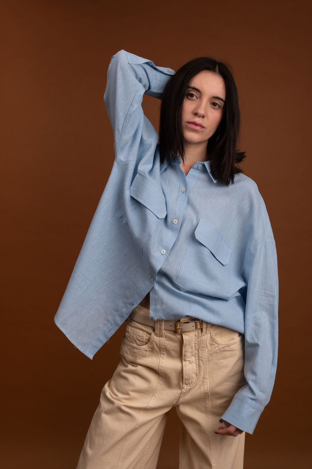 Esta camisa destaca-se por sua manga longa com punho de botão duplo, adicionando um toque refinado ao design. Os bolsos frontais é um detalhe prático e estiloso, perfeito para um look casual chic.