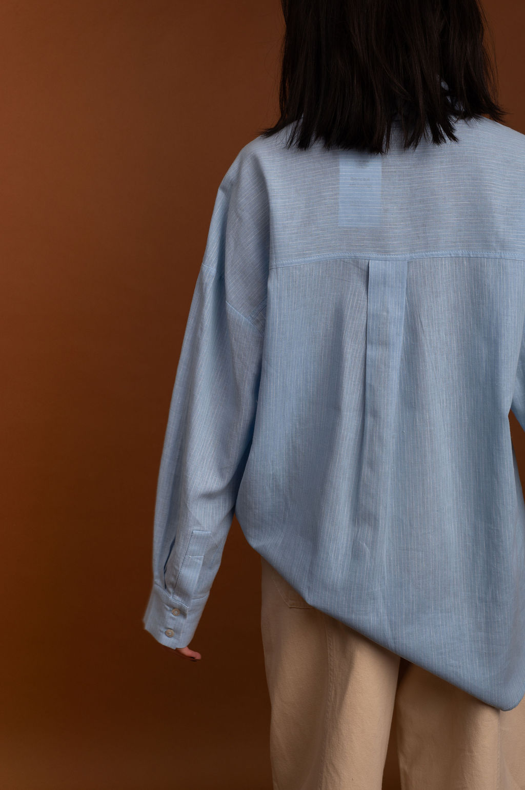 Na parte de trás, a camisa exibe uma prega fêmea central e uma pala nas costas, garantindo um caimento impecável e um visual moderno. O charme adicional é proporcionado pelos botões de madre pérola, que conferem um brilho sutil e sofisticado à peça.