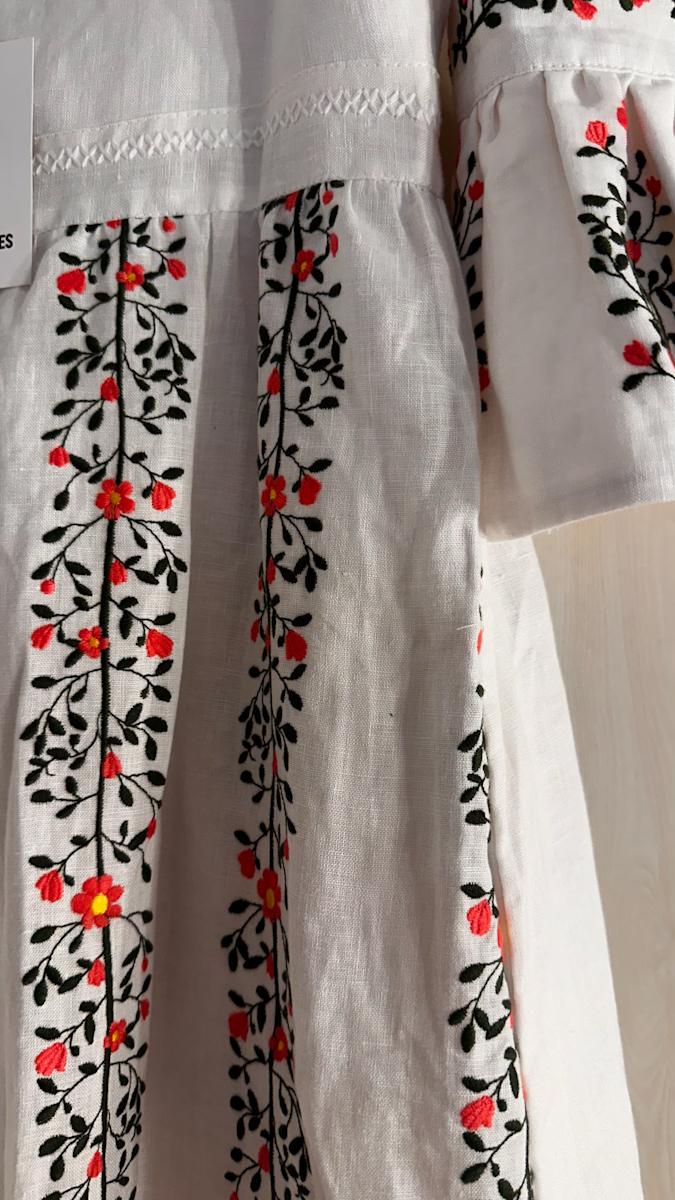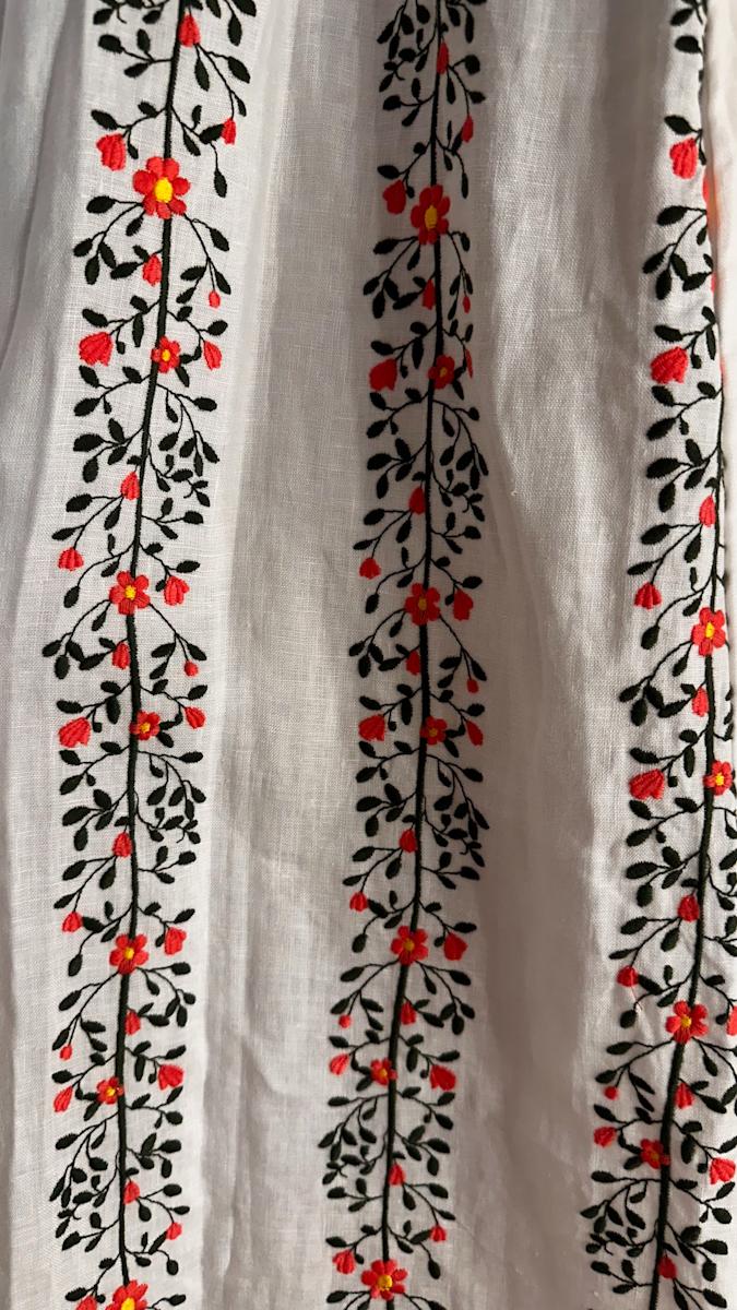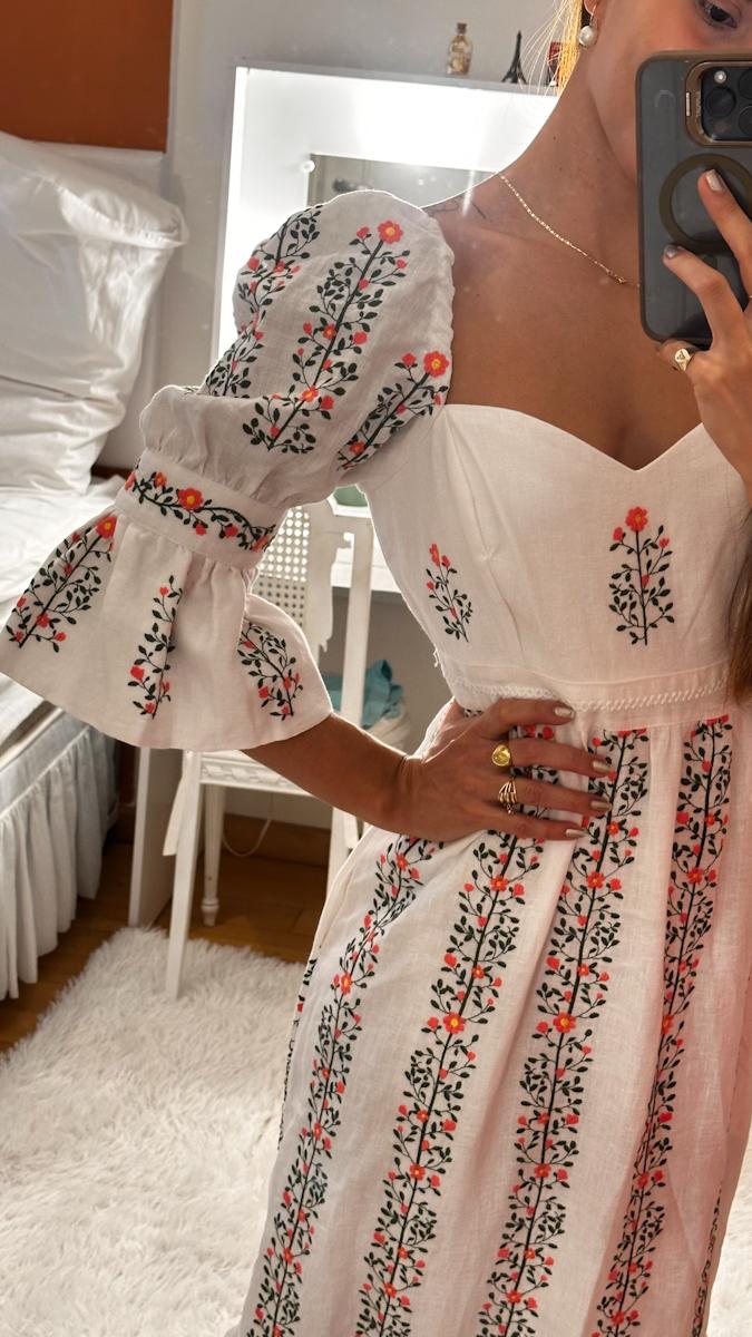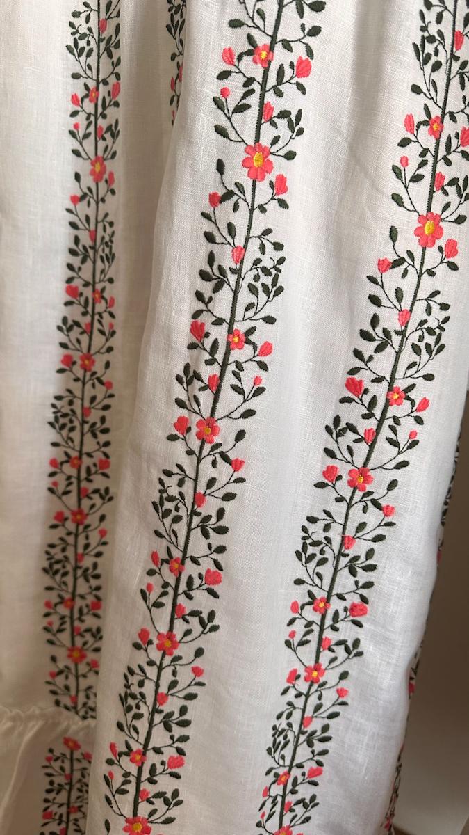 Vestido longo 100 % Linho, bordado artesanal, decote redondo, manga ampla, detalhe franzido na barra, e fechamento traseiro por zíper invisível. Sua modelagem valoriza o corpo, criando um caimento fluido e sofisticado. O bordado é o destaque central dessa peça. Ele adiciona textura e riqueza aos detalhes, proporcionando um acabamento artesanal e elegante.