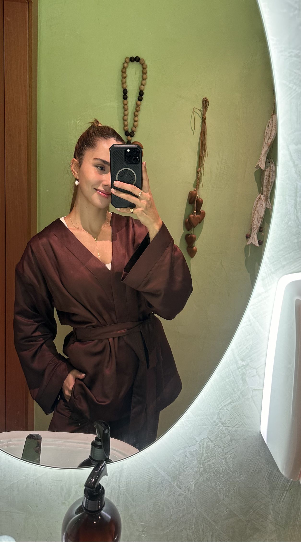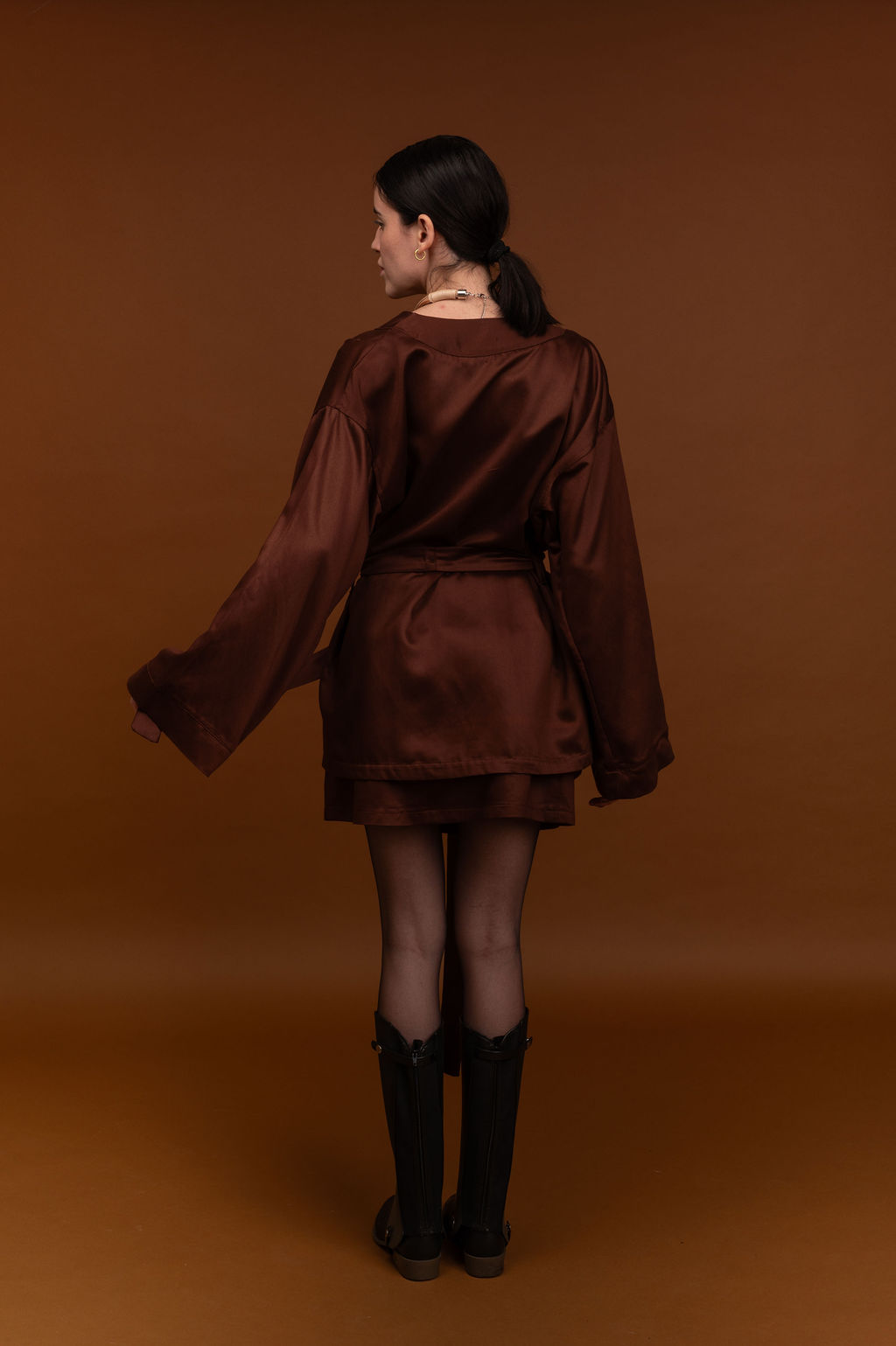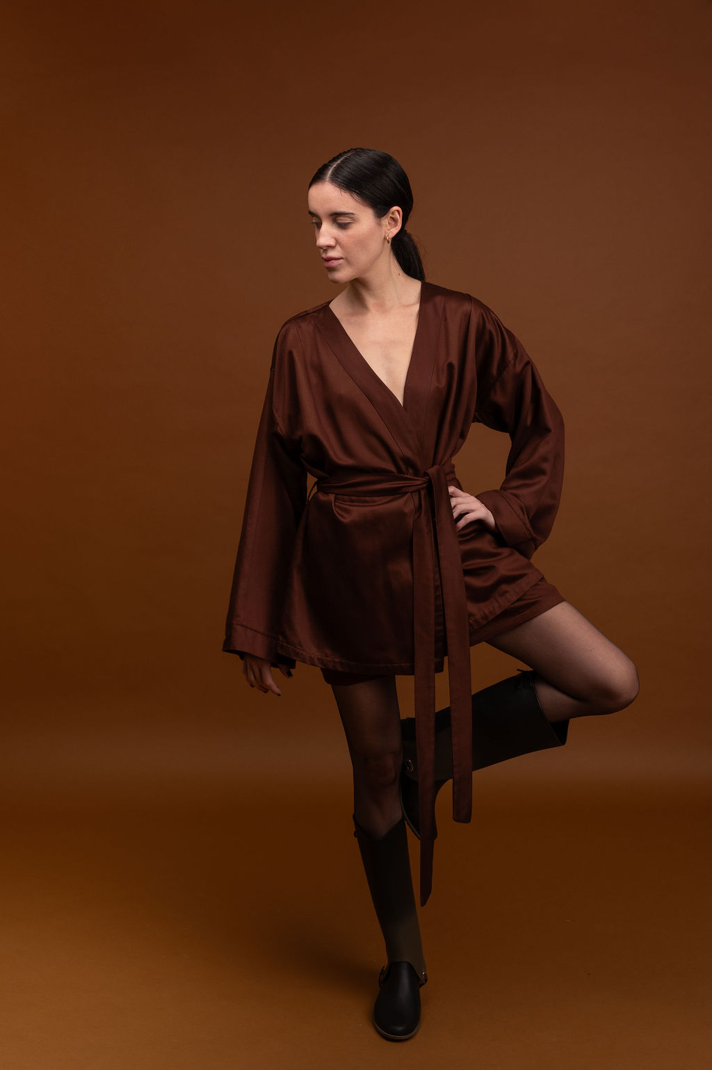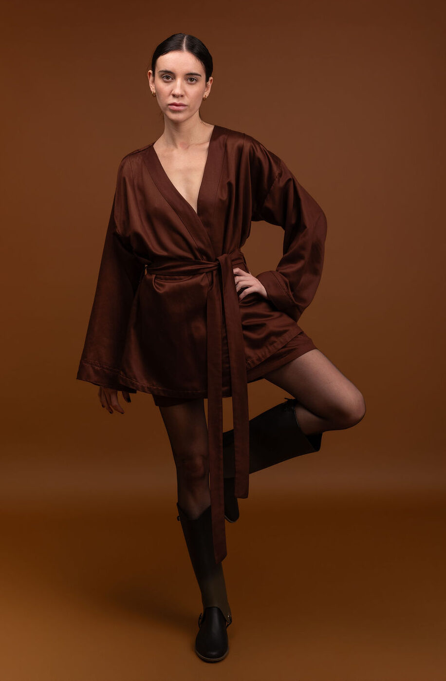 Kimono shape amplo, manga 7/8. Acompanha faixa. Tecido 100% viscose lenzing sustentável com leve acetinado.