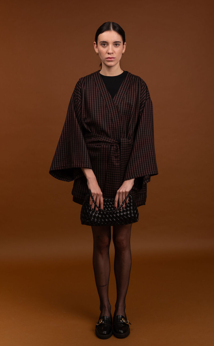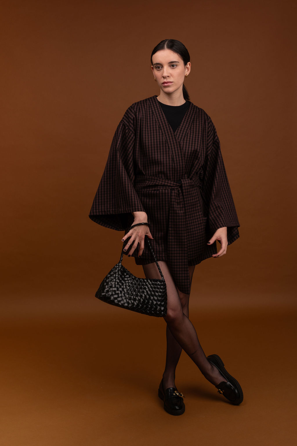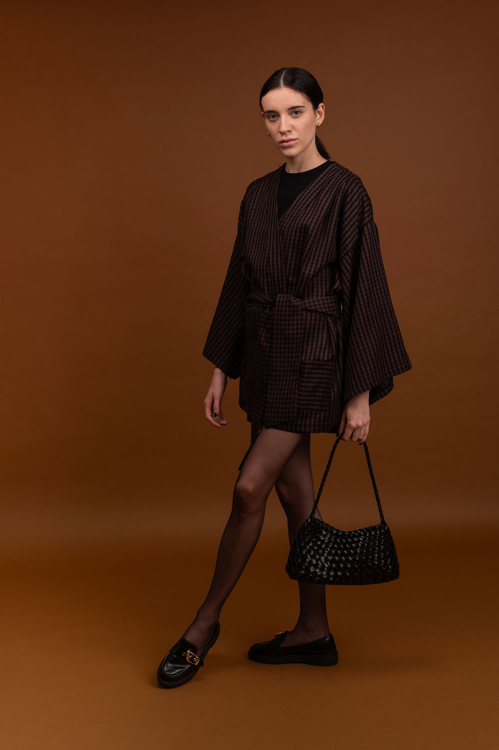 Kimono shape amplo, manga 7/8. Acompanha faixa. Tecido encorpado com leve xadrez no marrom e preto.