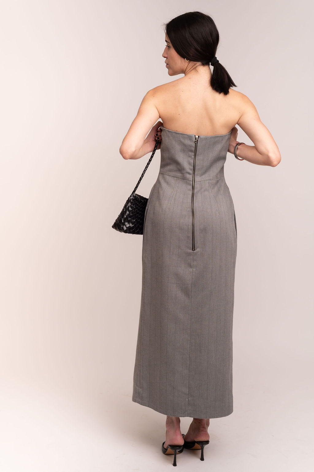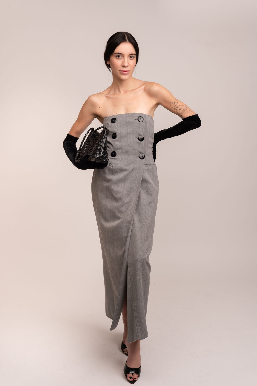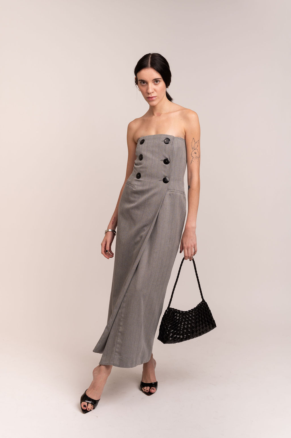 Confeccionada em viscose lenzing e algodão BCI, destaca-se pela modelagem e elegância. A modelagem alfaiataria regular valoriza a silhueta, enquanto o tomara que caia e os botões trazem um toque moderno. Perfeita para qualquer ocasião sofisticada.